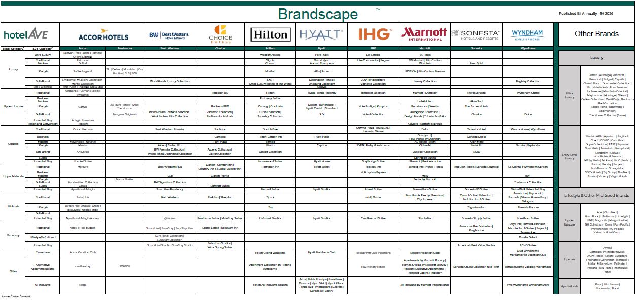 Brandscape™ covers 260+ brands across nine major parent companies and an additional 98 brands in the independent luxury and lifestyle space. It is the only resource that simplifies the complex web of sub-brands from major hospitality grups. We use it when evaluating hotel franchise and branding options and to identify white-space opportunities across regions and categories.